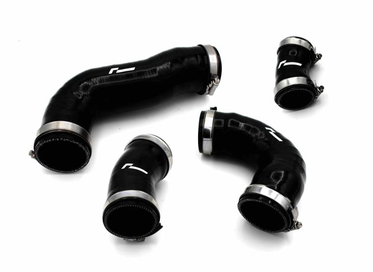 RacingLine trykslange / boost pipe kit til VW Polo AW GTI 2.0 TSI og Audi A1 GB 45TFSI modeller. Disse trykslanger erstatter de originale gummi slanger med flotte silikoneslanger, som øger luftflowet i systemet.