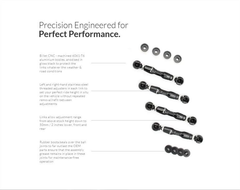 Dette sænkningskit er designet med høj kvalitsts led, og gummi, hvilket sikre en lang levetid uanset vejr, og vejforhold.