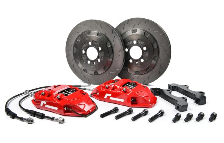 RacingLine VWR Big Brake Kit Stage 2 EVO med røde kalibre til VW Polo AW GTI, Audi A1 GB 40 TFSI og Seat Ibiza 6F Cupra modeller. Dette kit er med 345mm skiver 4 stemplede kalibre.
