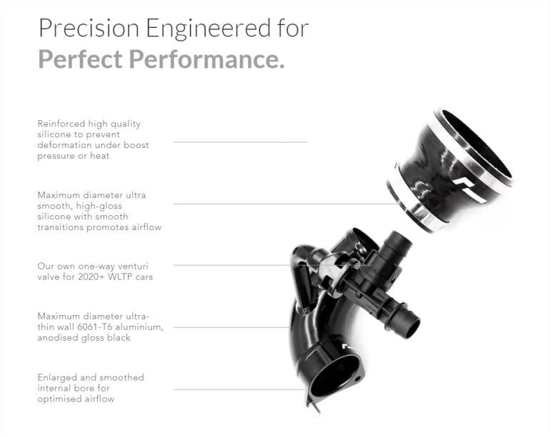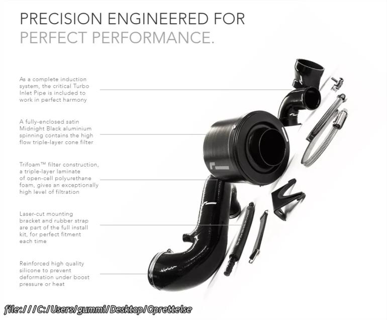 Sættet fjerner samtlige restriktioner foretaget af den originale indsugning og turbo albue - herudover er systemet lavet til at levere en lækker og sportslig motorlyd uden kompromis for effekt optimering.