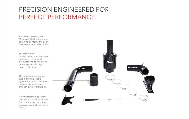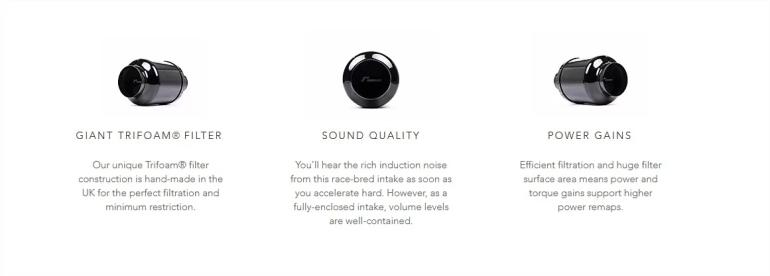 Systemet har direkte koldluftsindtag fra fronten, Filterkassen er optimeret til maksimal volumen, hvilket gør det muligt at lave filter overfladen betydeligt større (ca. dobbelt så stor som original) = bedre performance, og er god til over 600 hk.