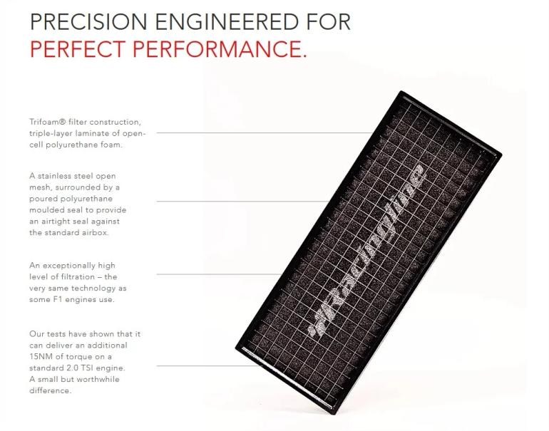 Tri-Foam panel luftfilter fra RacingLine til VAG PQ35 platformen med 2.0 TDI / 1.4 TSI / 2.0 TSI motoren.