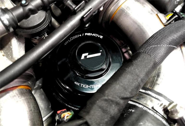 RacingLine oliefilterhus udført i eksklusivt sort anodiseret aluminiums hus til Audi B9 platformen (S4, RS4, S5, RS5 og SQ5)