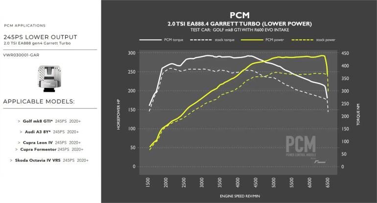 RacingLine PCM Tuning Box er en Plug & Play Chiptuning til VAG modeller som VW, Audi, Cupra og Skoda 2.0 TSI Gen.4 med EA888 motorkode og Garrett Turbo.